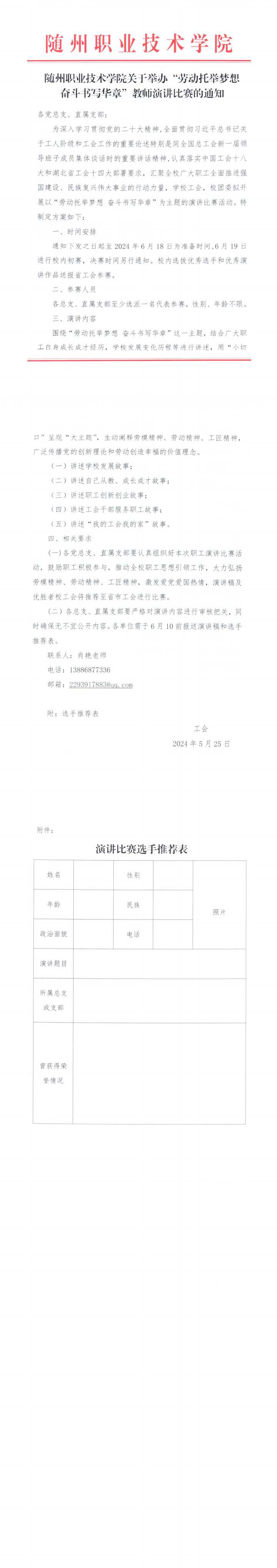 随州职业技术学院关于举办“劳动托举梦想 奋斗书写华章”教师演讲比赛的通知