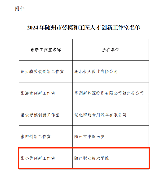根据随州市总工会《关于申报2024年随州市劳模和工匠人才创新工作室的通知》精神和要求,经信息工程学院申报,学校工会推荐,“张小勇创新工作室”入选为“随州市劳模和工匠人才创新工作室”,并获得随州市总工会拨付的专项建设资金2万元。