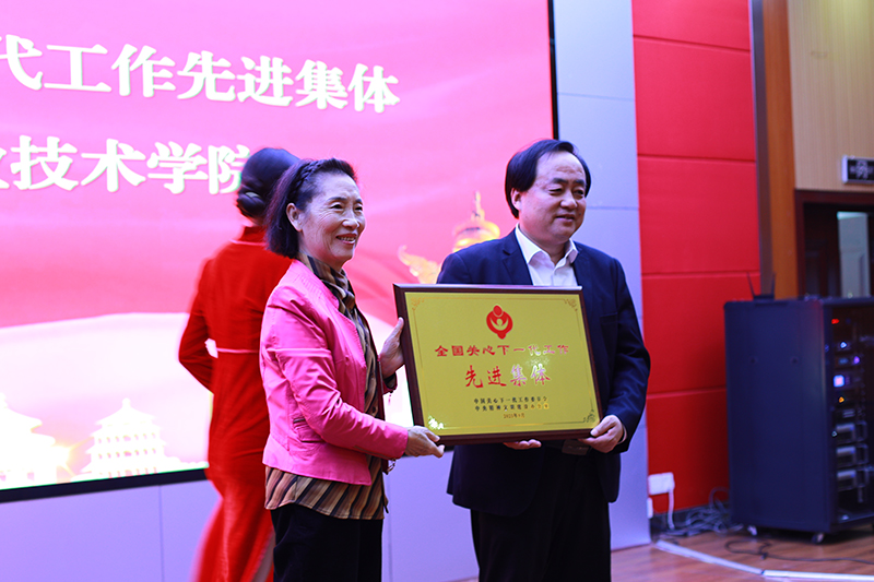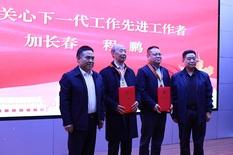 敖继霞向我校关工委颁授“全国关心下一代工作先进集体”奖牌。杨世勇、续立勇为荣获“全国关心下一代工作先进工作者”称号的加长春、程鹏同志颁发荣誉证书并佩戴奖章。